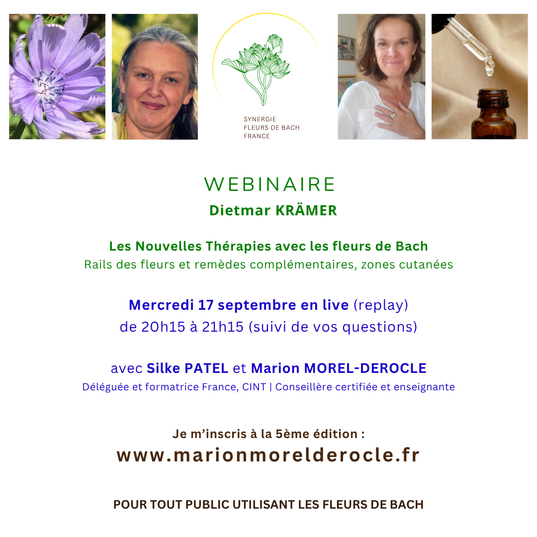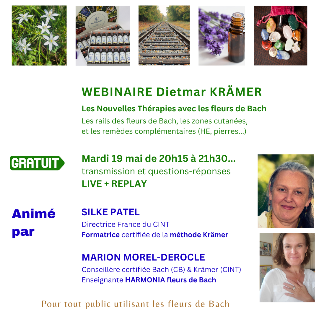 "Webinaire très intéressant. J’ai observé dans ma pratique des états émotionnels qui s’aggravent lors de la prise d’une fleur, ce qui est inconfortable pour le consultant et le thérapeute. Merci Silke, la méthode Krämer m’apporte un début de réponse. Merci à vous 2 ! Vous me donnez envie d’explorer davantage la méthode en me formant sérieusement car j'en ai appréhendée la complexité et l'accessibilité."